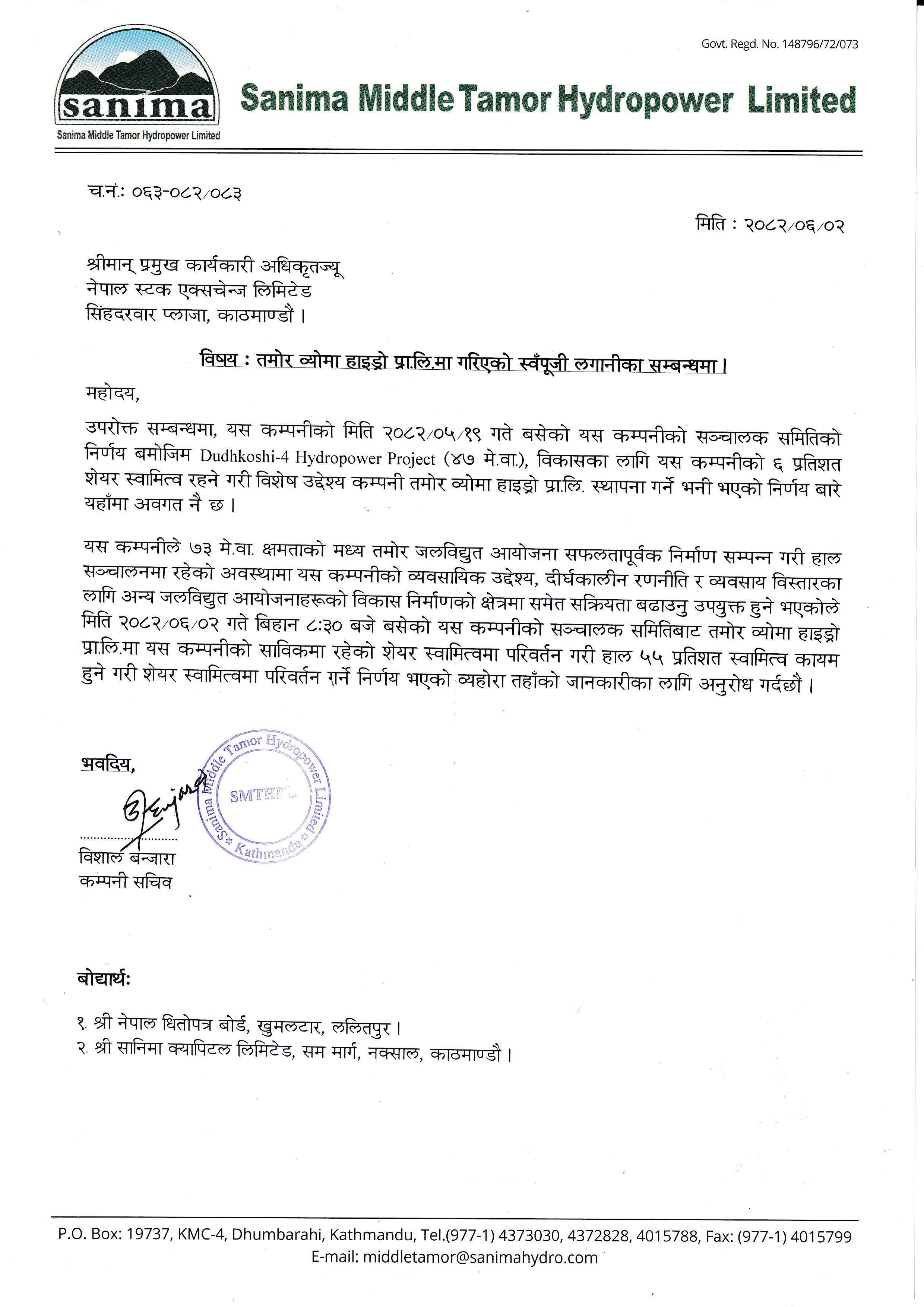 In the year 2009 AD 14th Nov. (29th Kartik 2065 BS) a special purpose vehicle “SPV” company – Tamor Sanima Energy Pvt. Ltd (TSE), was formed to further carry out Middle Tamor Hydropower Project (MTHP) and Upper Tamor Hydropower Project (415 MW) – upstream project owned by Sanima Hydro Group. The survey license of MTHP was then transferred from SHEPL to TSE on 27th June 2011 AD (23th Ashar, 2068 BS) in order to implement both the projects in an optimum and cost effective manner. In order to develop Middle Tamor Hydropower Project a separate “SPV” company – Sanima Middle Tamor Hydropower Ltd (SMTHL) was established in the year 2016 AD (Baishakh 2073 BS). The generation license of MTHP was then transferred from TSE to SMTHL on 2nd November 2017 AD (2074/07/16).